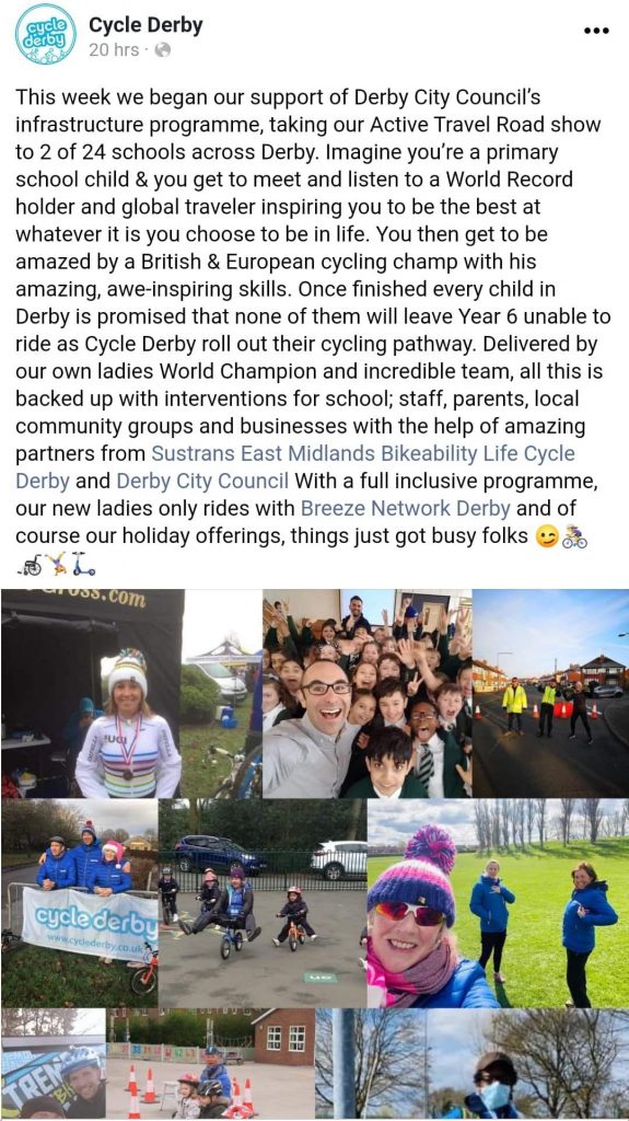 Without naming names as I’ve already had to spend last week learning new legal terms, I also reiterated my concerns about Cycle Derby’s specific choice of men given that one of them has unfortunately harassed and objectified women in a work capacity, and mocked people of colour and gay men via his personal social media over the course of the past six months. I feel has shown no meaningful acknowledgement or remorse for how he has conducted himself despite multiple formal complaints. Cycle Derby are aware of his behaviour, yet he remains a choice role model for children in our city’s schools which I personally find very disconcerting.