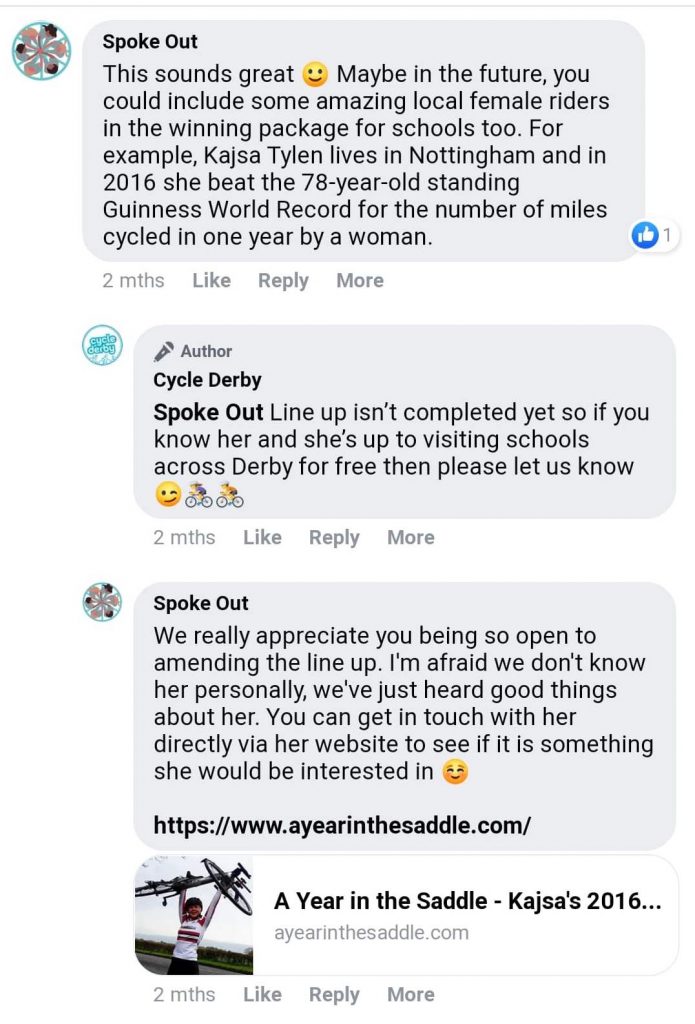 We’ve been aware of this tour since March when I politely asked if it was possible for Cycle Derby to consider more diverse representation. I felt that two white male able-bodied elite athletes would not be the easiest to relate to for someone like 8 year old Fatima who attended a Dr.Bike I supported in Normanton Park a couple of weeks ago. I figured I’d have the most success by sticking to the record breaking theme, so I therefore suggested the wonderful and local Kajsa Tylen and provided contact information. Unusually, we actually received a reply but we were told she would have to do the tour for free. When I asked Mark Smith if Leigh and Danny are also doing the tour for free he deleted the above LinkedIn post.